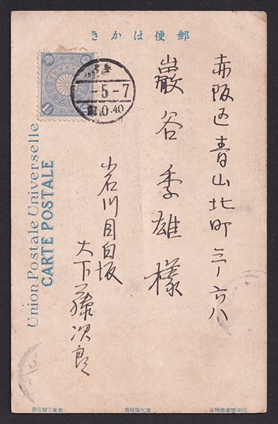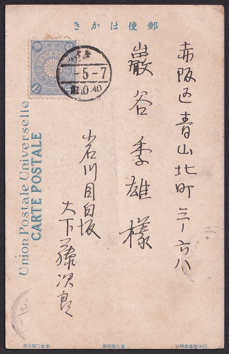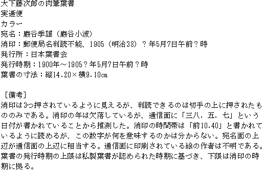 大下藤次郎の肉筆葉書(1905?年5月7日消印)