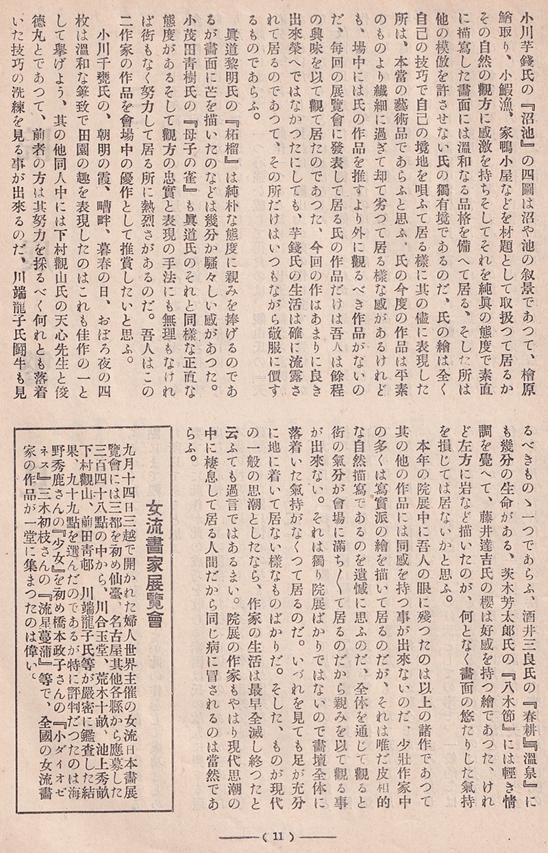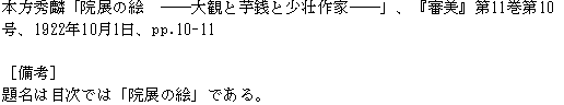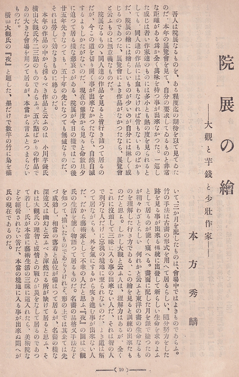 資料室 > 入口 > 一覧 > 瞑花文庫 > 展覧会 > 団体展 > 再興日本美術院 > 第9回院展 > 『審美』第11巻第10号 > 本方秀麟「院展の絵 ――大観と芋銭と少壮作家――」
