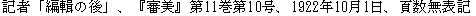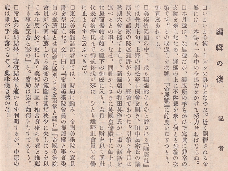 資料室 > 入口 > 一覧 > 瞑花文庫 > 展覧会 > その他 > 帝展 > 第4回 > 『審美』第11巻第10号 > 記者「編輯の後」