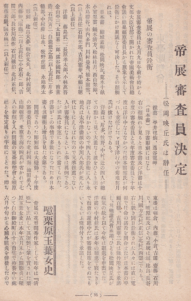 一記者「帝展審査員決定 ――(松岡映丘氏は辞任――」