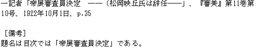 資料室 > 入口 > 一覧 > 瞑花文庫 > 展覧会 > その他 > 帝展 > 第4回 > 『審美』第11巻第10号 > 一記者「帝展審査員決定 ――(松岡映丘氏は辞任――」
