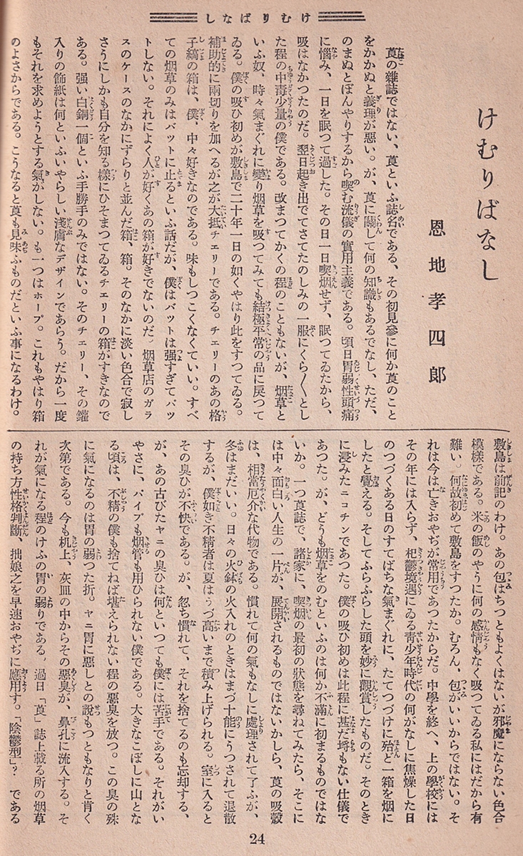 資料室 > 入口 > 一覧 > 瞑花文庫 > 作家 > 恩地孝四郎 > 「けむりばなし」(『莨』第1巻第8号)