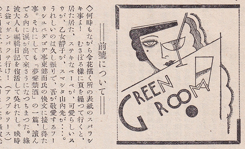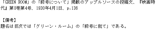 資料室 > 入口 > 一覧 > 瞑花文庫 > 作家 > 沢令花 > 『映画時代』第8巻第4号所載の文献 > 「GREEN ROOM」の「前号について」掲載のアップルソースの投稿文