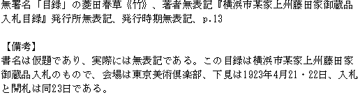 資料室 > 入口 > 一覧 > 瞑花文庫 > 作家 > 菱田春草 > 『横浜市某家上州藤田家御蔵品入札目録』 > 無署名「目録」の菱田春草《竹》